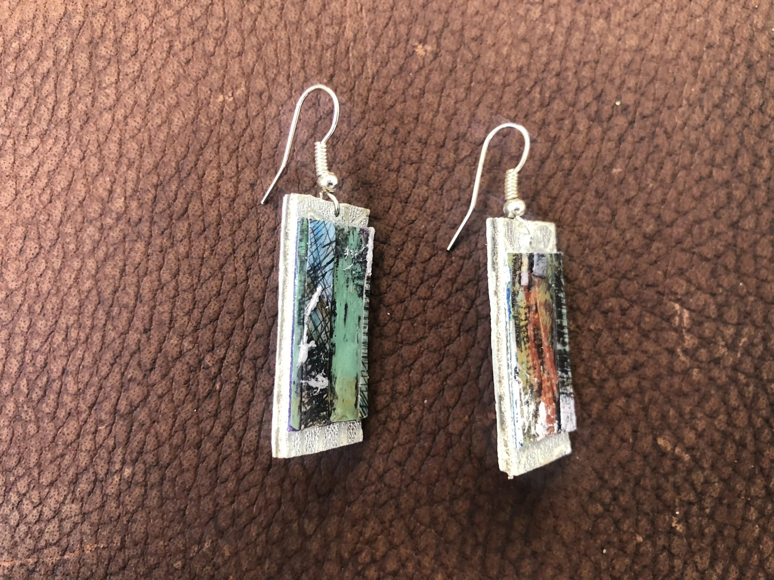 Be a walking art gallery with this distinctive pair of Gallery Earrings! They are handmade and one of a kind. The earrings’ main feature of tiny art is cut from a mixed media canvas. The mixed media includes collage and printmaking techniques using paper, pen, paint, and gloss. The backing is genuine soft leather that has an organic line etched design. The ear hook is hypoallergenic and they are very light weight as well as eye catching with their asymmetrical coloring and texture.